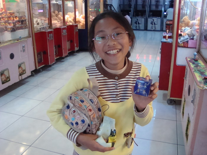 下了火車,被茹拉到車站對面的夾娃娃店裏,要我夾娃娃給她,看了看真是不好夾,嘴裏唸著”不要啦!一定夾不到的”,結果還是忍不住試了一下,花了20元就夾到2個,是我技術太好還是手氣太好 ??